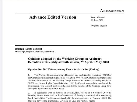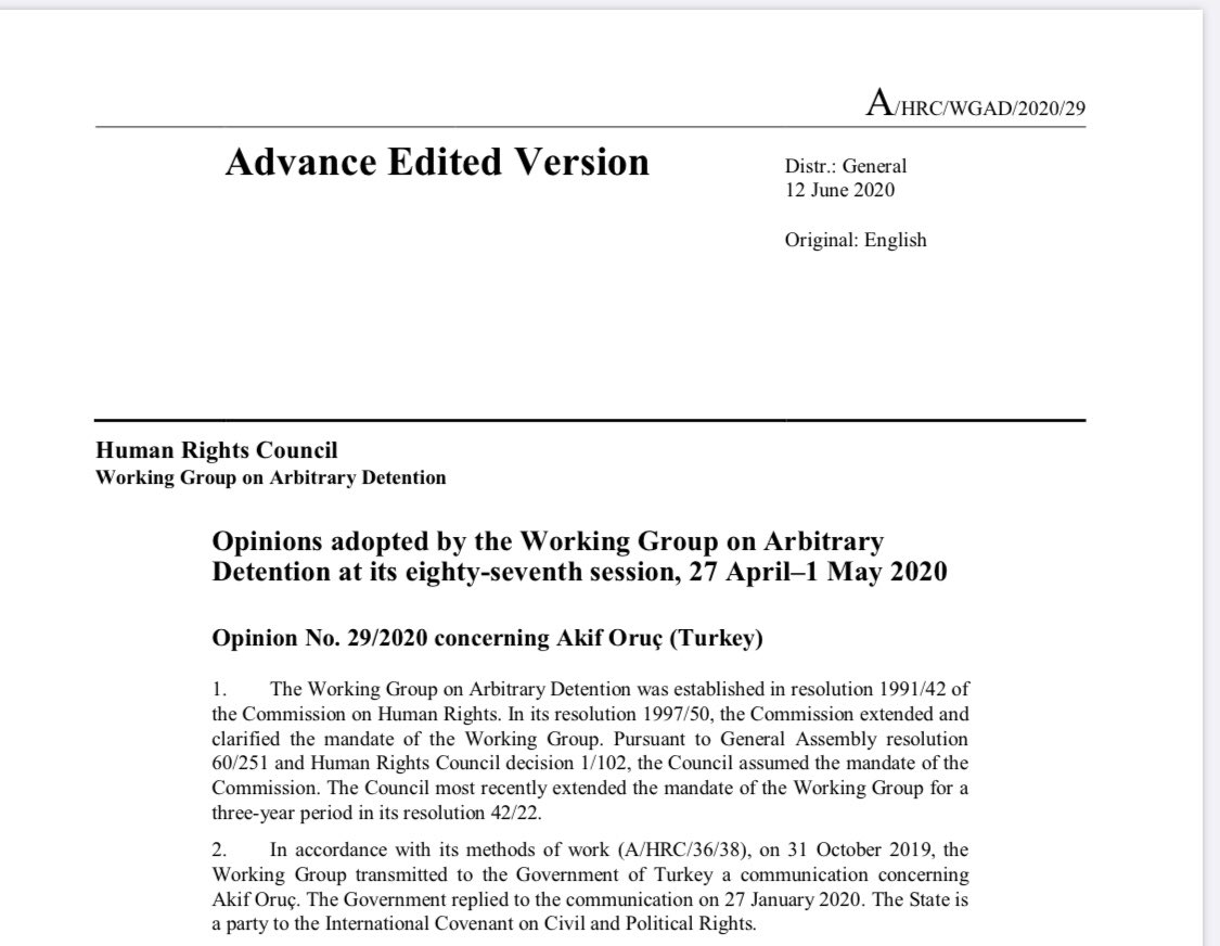 BM Keyfi Tutuklama Çalışma Grubu, 27 Nisan - 1 Mayıs tarihlerinde gerçekleşen oturumda Türkiye'ye yönelik 3 görüşe yer verdi, görüşlerde ilgili başvurucuların tutukluluklarının uluslararası standartlara uygun hale getirilmesi için tavsiyede bulundu.