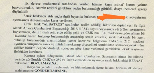 Ekte resmi yer alan BAM kararına göre albatros kod adlı gizli tanığın teslim ettiği dijital materyalde sanığın isminin geçip geçmediğinin araştırılması gerektiği ifade edilmiştir, yine aleyhe beyanda bulunan tanığın duruşmada dinlenilmeden karar verilmesi nedeniyle BERAAT kararının kaldırılmasına karar verilmiştir.