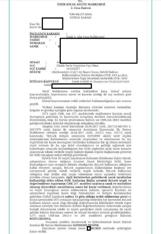 Ekte resmi yer alan Bölge Adliye Mahkemesi kararı incelendiğinde bylock ile ilgili ayrıntılı araştırma yapılması, gerekirse teknik bilirkişi raporu alınması, temin edilen belgelerin duruşmada okunması ile sanık ve müdafiine diyeceklerinin sorulması, her türlü kuşkudan uzak ilgilinin bylock programı kullanıcısı olduğunun ispat edilmesi gerektiği ifade edilmiştir