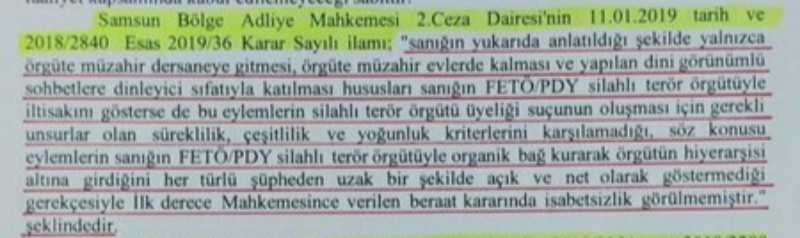 Ekte resmi yer alan Bölge Adliye Mahkemesi kararı incelendiğinde evlerde kalma, dershaneye gitme ile dinleyici olarak sohbetlere katılmanın cezalandırmaya yeterli olmadığı dile getirilmiştir, önemli bir karardır, milat öncesi veya sonrası ayrıma gidilmemiştir. Karar ektedir;