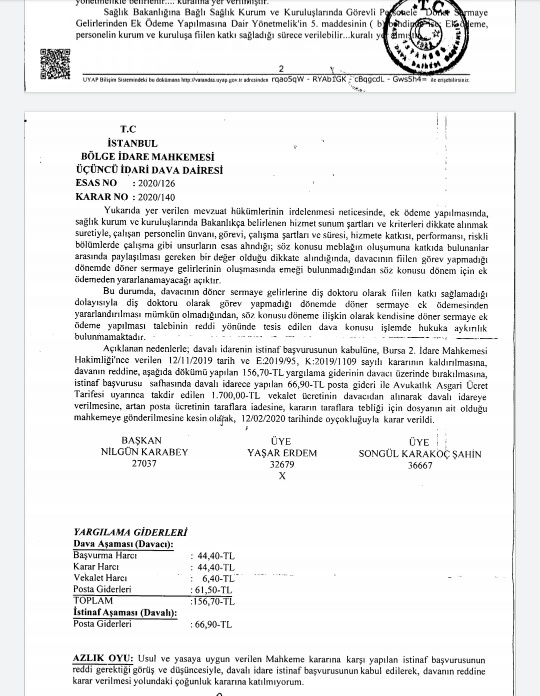 Ekte ilgili kısmı yer alan Bölge İdare Mahkemesi kararı incelendiğinde göreve iade edilen sağlık personelinin döner sermaye ödenmesi amacıyla açtığı davanın İdare mahkemesince kabulüne karar verilmiştir, bu karara davalı kurum tarafından yapılan istinaf başvurusu üzerine Bölge İdare Mahkemesi döner sermaye ödenmesine ilişkin İdare Mahkemesi kararının kaldırılmasına OYÇOKLUĞUYLA KESİN OLARAK karar verilmiştir, sonuç olarak ilgiliye döner sermaye ödenmeyecektir, kararın ilgili kısmı ektedir;