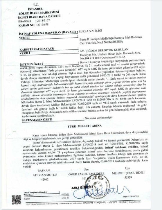 Ekte resmi yer alan Bölge İdare Mahkemesi kararı incelendiğinde göreve iade edilen polis memuruna fazla çalışma ücretinin ödenmesine dair İdare Mahkemesi kararına yapılan istinaf başvurusunun reddine kesin olarak karar verilmiştir, bu şekilde göreve iade edilen polis memuruna fazla çalışma ücretinin ödenmesi gerektiği hüküm altına alınmıştır.