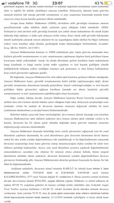 Ekte resmi yer alan BİM kararına göre olumsuz güvenlik soruşturması nedeniyle ataması yapılmayan ilgilinin bu işleme karşı açtığı davanın reddine karar verilmiştir, bu red kararına karşı yapılan istinaf başvurusu sonucunda ekteki BİM KARARI İLE İDARE MAHKEMESİ KARARININ KALDIRILMASI İLE DAVA KONUSU İŞLEMİN İPTALİNE KARAR VERİLMİŞTİR, AYM KARARI DOĞRULTUSUNDA KARAR VERİLMİŞTİR.