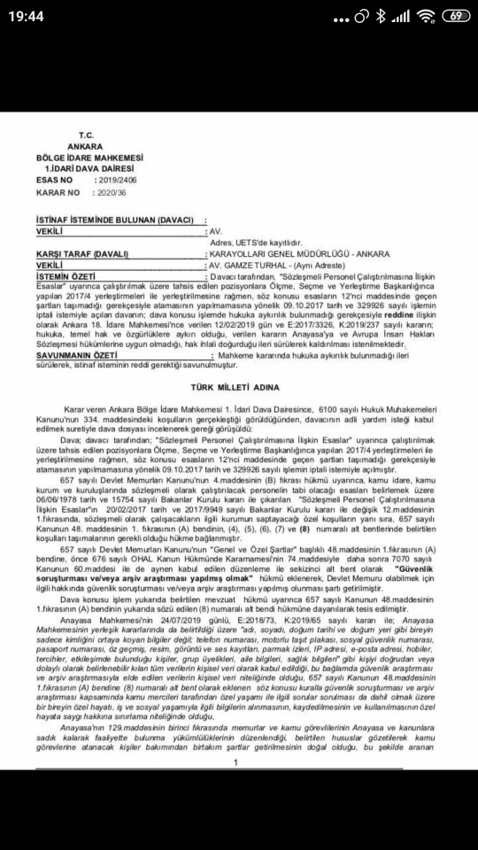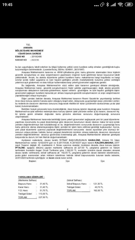 Güvenlik soruşturmasının olumsuz sonuçlandığından bahisle atamasının yapılmamasına ilişkin işlemin iptali istemiyle açılan, davada her ne kadar ilk derece mahkemesi tarafından davanın reddine karar verilmiş ise de; İstinaf Mahkemesi Anayasa Mahkemesi'nin 24/07/2019 günlü, E:2018/73, K:2019/65 sayılı kararını da gözeterek İstinaf İsteminin KABULÜ ile dava konusu işlemin İPTALİNE kesin olarak karar vermiştir.