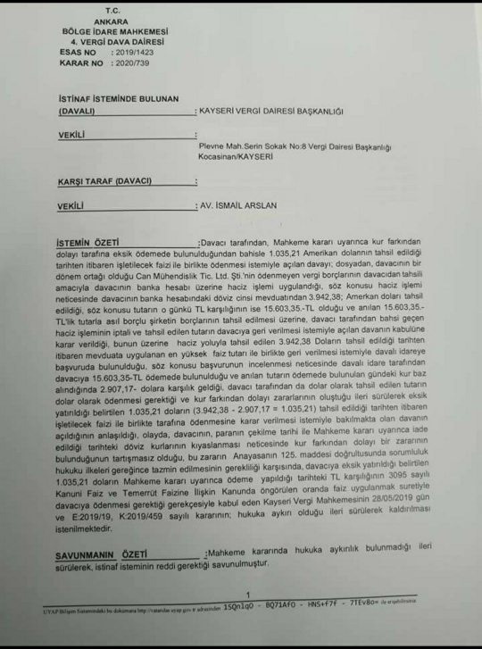 Ekte resmi yer alan Bölge İdare Mahkemesi kararı incelendiğinde dolar cinsinden tahsilin yapıldığı tarih ile haksız tahsilin iadesinin yapıldığı gün arasındaki KUR FARKINDAN oluşan zararın ilgiliye ödenmesi amaçlı açılan davanın kabulüne karar verilmiştir, bu şekilde kur farkından kaynaklanan zararın idarece ödenmesi gerektiği hüküm altına alınmıştır, karar kesin olarak verilmiştir, AYRICA İLGİLİYE FAİZİYLE BİRLİKTE GERİ ÖDEME YAPILMASI GEREKTİĞİ DE DİLE GETİRİLMİŞTİR.