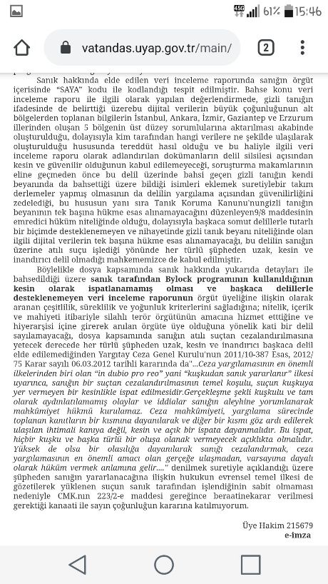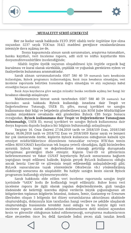 Ekte resmi yer alan Ceza Mahkemesi kararının ilgili kısmı incelendiğinde hakkında bylock kullanıcısı olma ve garson kodlaması iddiaları olan kişi hakkında yapılan ceza yargılaması sonucunda OYÇOKLUĞUYLA mahkumiyetine karar verilmiştir, ekte resmi yer alan beraate yönelik muhalefet şerhi incelendiğinde hem bylock hem garson kodlaması ile ilgili önemli tespitler içermektedir, hem idari hem ceza yargılamasına emsal olarak sunulabilir, muhalefet şerhi ektedir;