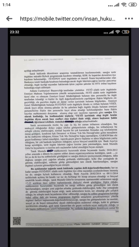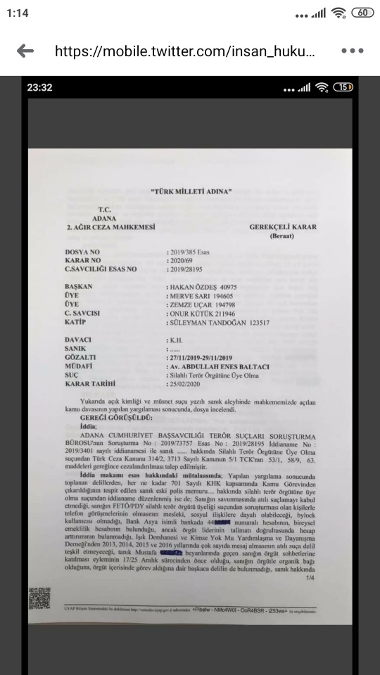 Kodlama, Bank Asya Hesabı, Tanık Beyanı ile Kimse Yok Mu Derneğinden Mesaj Almaya dair iddiaların olduğu dosyaya ilişkin beraat kararı