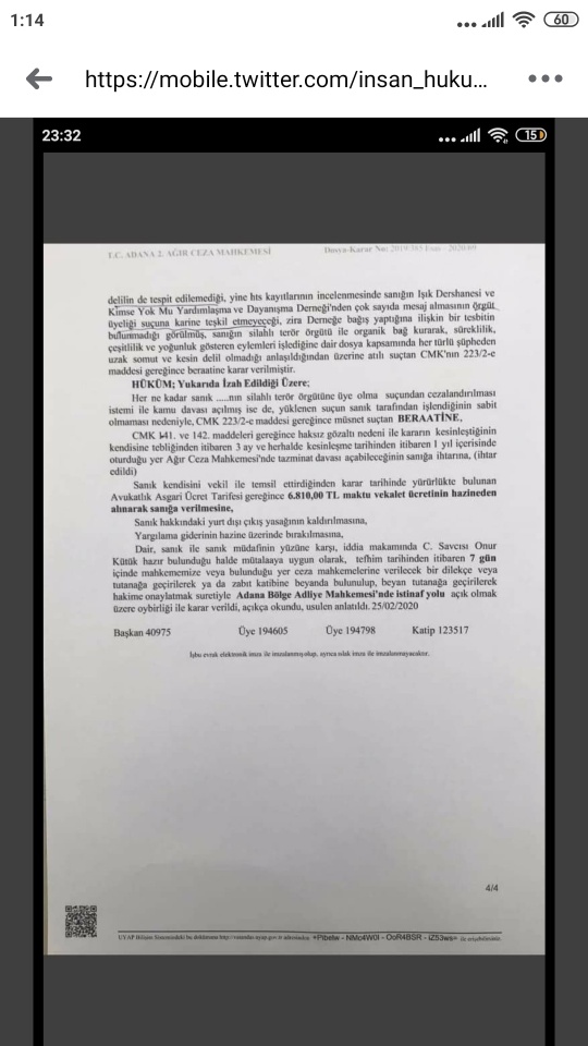 Adana 2. Ağır Ceza Mahkemesi 25.02.2020 tarihli Beraat Kararı;