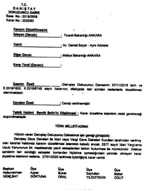 Danıştay, fazla vergiye dair kararda, düzeltme istemini reddetti
