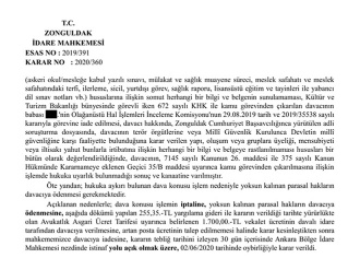 Zonguldak 1. İdare Mahkemesi, suçun şahsiliği ilkesini dikkate alarak Babası KHK ile atıldığı gerekçesi ile "iltisak/irtibat" olduğu gerekçesi ile atlan memur lehine karar verdi.