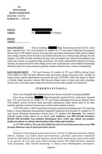Mahkeme Kararında şu gerekçelere yer verdi: "Bu durumda; davacının Bank Asya nezdinde herhangi bir hesabının bulunmaması, davalı idare tarafından, davacının FETÖ/PDY Silahlı Terör Örgütüne üyeliği, iltisakı veya irtibatı olduğunu gösteren (askeri okul/mesleğe kabul yazılı sınavı, mülakat ve sağlık muayene süreci, meslek safahatı ve meslek safahatındaki terfi, ilerleme, sicil, yurtdışı görev, sağlık raporu, lisansüstü eğitim ve tayinleri ile yabancı dil sınav notları vb.) hususlarına ilişkin somut herhangi bir bilgi ve belgenin sunulamaması, Kültür ve Turizm Bakanlığı bünyesinde görevli iken 672 sayılı KHK ile kamu görevinden çıkarılan davacının babasının Olağanüstü Hal İşlemleri İnceleme Komisyonunun 29.08.2019 tarih ve 2019 35538 sayılı kararıyla görevine iade edilmesi, davacı hakkında, Zonguldak Cumhuriyet Başsavcılığınca yürütülen adli soruşturma dosyasında, davacının terör örgütlerine veya Milli Güvenlik Kurulunca Devletin milli güvenliğine karşı faaliyette bulunduğuna karar verilen yapı, oluşum veya gruplara üyeliği, mensubiyeti veya iltisakı yahut bunlarla irtibatına ilişkin herhangi bir bilgi ve belgeye rastlanılmaması hususları bir bütün olarak değerlendirildiğinde, davacının, 7145 sayılı Kanunun 26. maddesi ile 375 sayılı Kanun Hükmünde Kararnameye eklenen Geçici 35/B maddesi uyarınca kamu görevinden çıkarılmasına ilişkin işlemde hukuka uyarlık bulunmadığı sonuç ve kanaatine varılmıştır."
