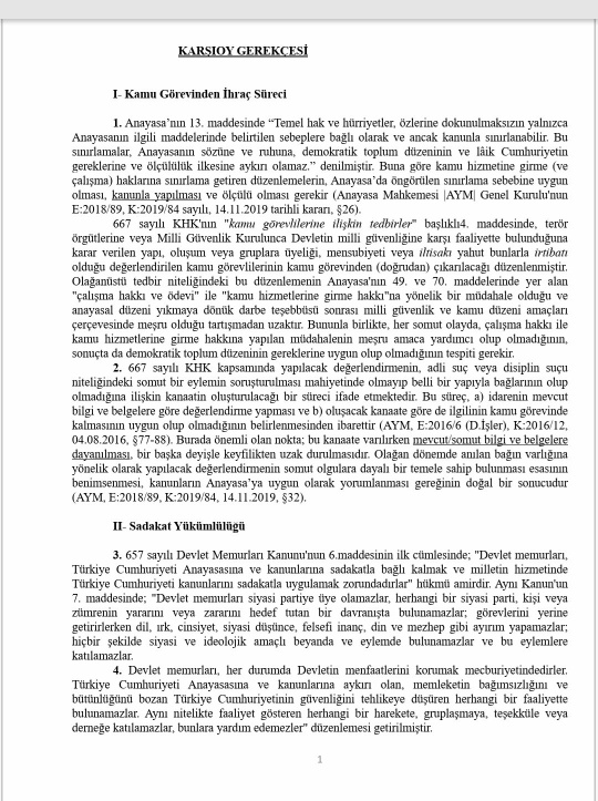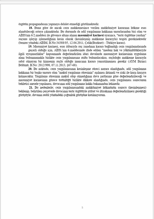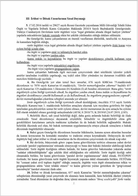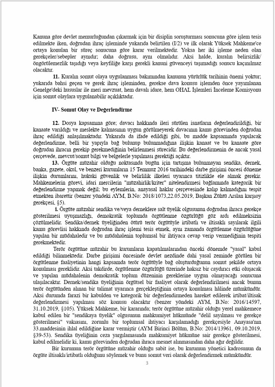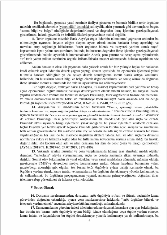 Banka hesabı, sendika ile dernek üyeliği ve gazete aboneliği dair kriterlerin olduğu dosyada ilgilinin göreve iade talepli açtığı davanın reddine OYÇOKLUĞUYLA karar verilmiştir, ekte resmi yer alan azlık oyu önemli tespitler içermektedir, sendika ile dernek üyeliğinin örgütlenme özgürlüğü kapsamında olduğu, banka hesabının irtibat ve iltisak için yeterli sayılamayacağı, masumiyet karinesi gereği ceza davasının sonucunun beklenilmesi gerektiği ifade edilmiştir. İlgili hakkında ceza mahkemesince yapılan yargılama sonucunda bilerek ve isteyerek yardım etme suçundan mahkûmiyet kararı verilmiştir.