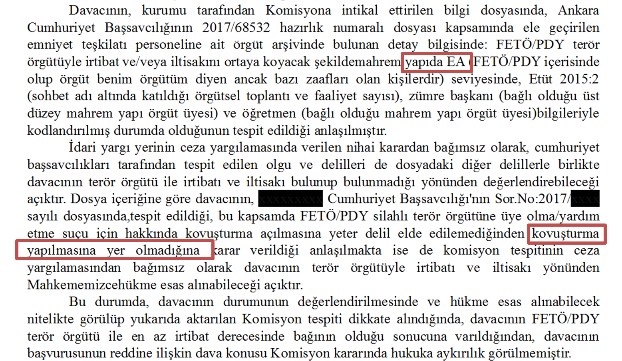 Ekte resmi yer alan İdare Mahkemesi kararı incelendiğinde sadece garson kodlamasının yer aldığı dosyada ilgilinin göreve iade talepli açtığı davanın reddine karar verilmiştir, ilgili hakkında savcılıkça yürütülen soruşturma sonucunda takipsizlik kararı verilmiştir, İdare Mahkemesince karar oybirliğiyle alınmıştır, Garson Kodlaması ile ilgili diğer İdare Mahkemelerince verilen kararlarda azlık oyu bulunmasına rağmen bu kararda muhalefet şerhi yer almamaktadır.