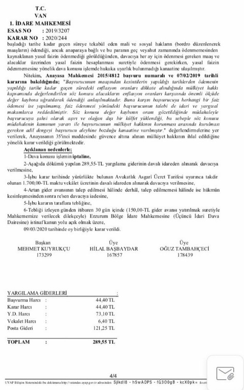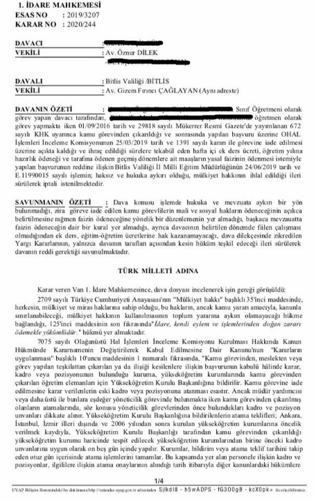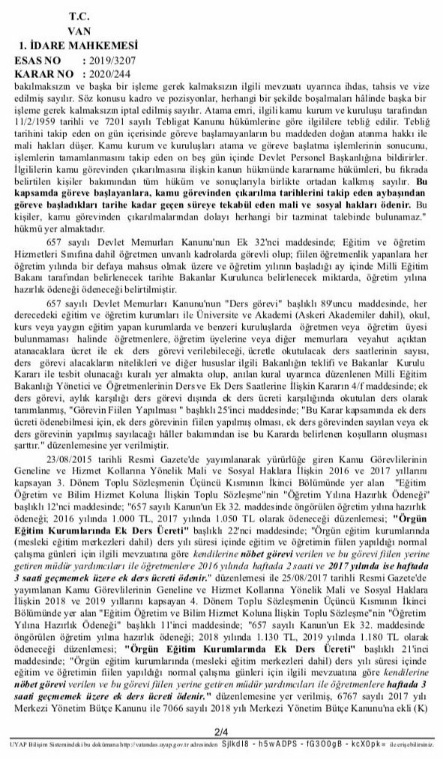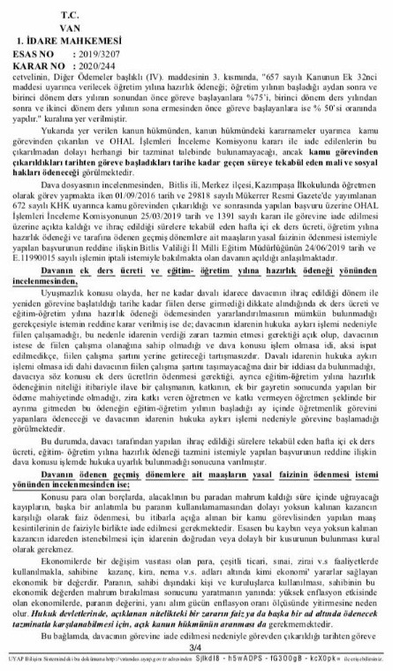 Ekte resmi yer alan İdare Mahkemesi kararı incelendiğinde göreve iade edilen öğretmenin açtığı davada ek ders ücretleri, hazırlık ödenekleri ile geriye dönük ödenen toplu maaşın yasal faizinin yasal faizleriyle ödenmesine karar verilmiştir, karar ektedir;