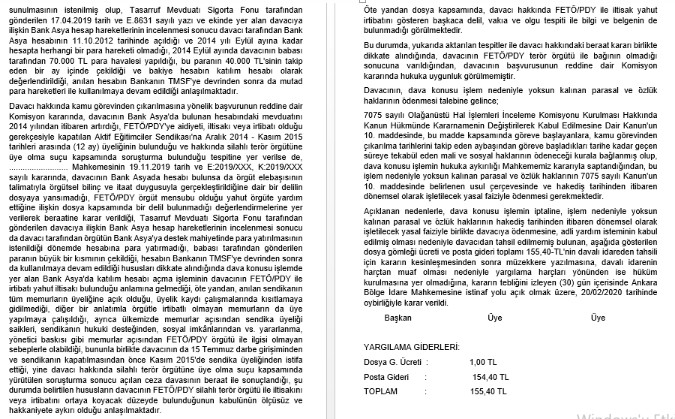 Göreve iade kararı ve Bank Asya'nın TMSF'ye devri sonrası hesabın kullanılmasına vurgu yapılması