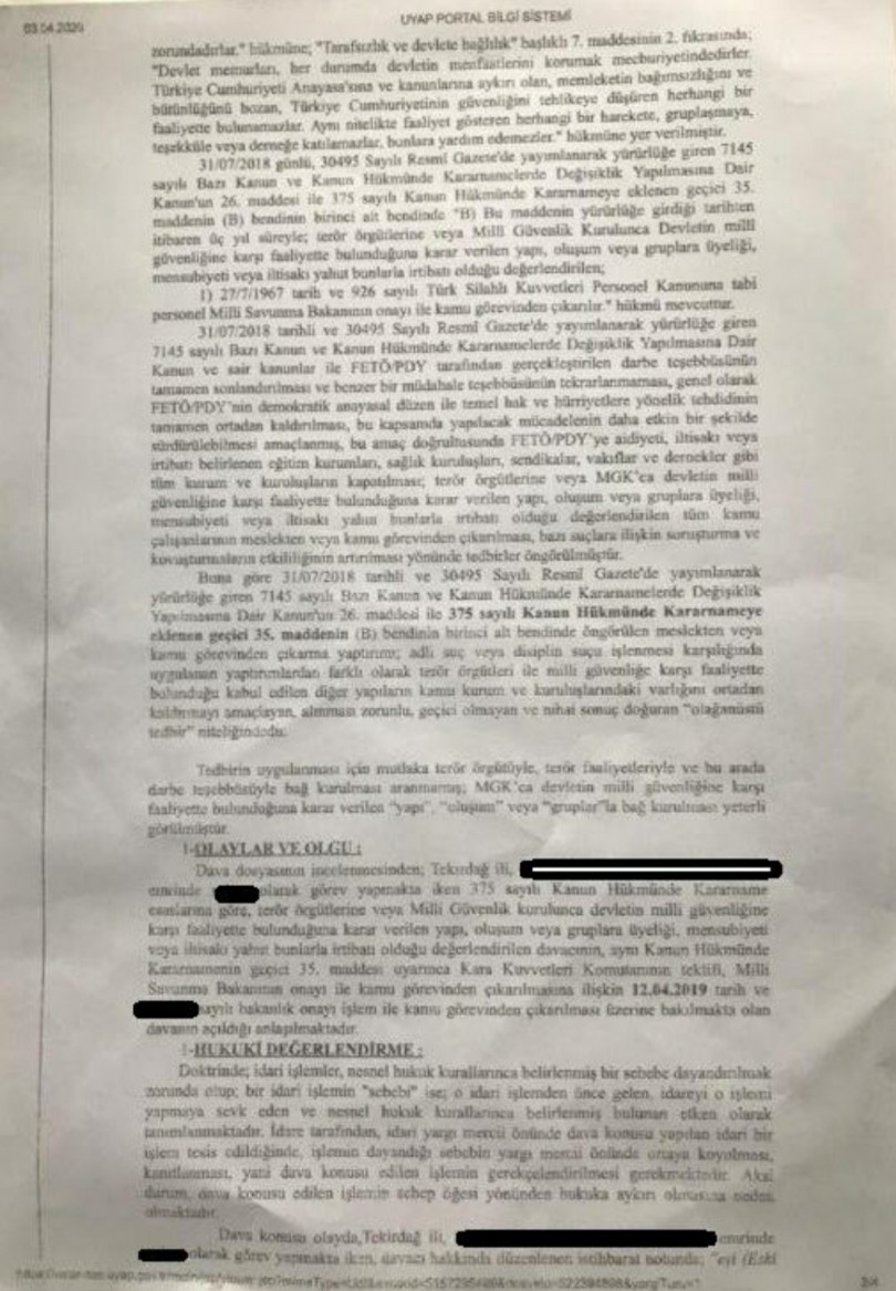 Ekte resmi yer alan İdare Mahkemesi kararına göre eş hakkında yürütülen soruşturma ilgili açısından kamu görevinden çıkarma gerekçesi yapılamaz, idarenin kişinin eşinin durumu nedeniyle husumetle hareket edeceği iddiası soyut niteliktedir, somut ve objektif kriterlere dayalı işlem yapılması gerekir.