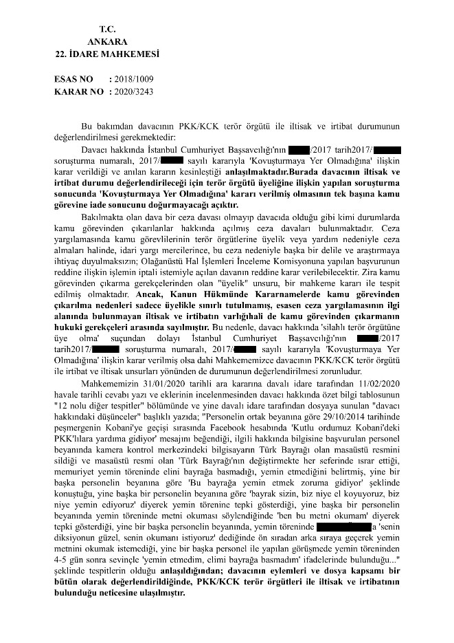 Ekte ilgili kısmı yer alan İdare Mahkemesi kararı incelendiğinde ilgili hakkında kurum kanaatine dair kriterin olduğu dosyada ilgilinin göreve iade talepli açtığı davanın reddine karar verilmiştir, kişi hakkında yapılan adli soruşturma sonucunda takipsizlik kararı verilmiştir, sadece kurum kanaatine dayalı dava red kararı vermek hakkaniyetli ve adil bir yaklaşım değildir, kurum kanaatine dayanak teşkil eden personellerin tanık sıfatıyla beyanlarına başvurulması ve çıkan sonuca göre işlem tesis edilmesi gerekmektedir, belki de kurumda husumeti olan biri iftira atma kastıyla veya bir makama kendisine rakip olarak gördüğü davacıyı bertaraf etmek amacıyla hareket edilmiş olunabilir, MUTLAK ADALETİN TESİSİ İÇİN HER TÜRLÜ ŞÜPHENİN YENİLMESİ ADINA KAPSAMLI ARAŞTIRMA YAPILMALIDIR, BU DOĞRULTUDA KANAATE DAYANAK TEŞKİL EDEN TÜM SOMUT BİLGİLERİN ORTAYA KONULMASI BÜYÜK ÖNEM ARZ ETMEKTEDİR. kararın ilgili kısmı ektedir;