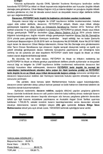 Sendika, Kimse Yok Mu Derneğine Bağış ve Cihan Medya Ödemesinin kriterlerinin olduğu ve bu tespitlerden dolayı kişi hakkında yürütülen adli soruşturma neticesinde takipsizlik kararının verildiği dosyada İdare Mahkemesi göreve iade talepli açılan davanın reddine karar vermiştir, karar gerekçesi incelediğinde yukarıdaki kriterlerden dolayı davacının normal vatandaştan beklenen düzeyden daha yoğun ilişkiye girmesinden bahsedilmektedir, red kararlarında genelde bu ifade kullanılmaktadır, bu cümle hukuki değildir, yazılı kriterlerin yerine getirildiği dönemde İLGİLİNİN TERÖR ÖRGÜTÜ İLE BİLEREK VE İSTEYEREK İRTİBAT KURUP KURMADIĞI, TERÖR ÖRGÜTÜNÜN VARLIĞINDAN HABERDAR OLUP OLMADIĞININ DA DEĞERLENDİRİLMESİ GEREKMEKTEDİR, BU İNCELEME YAPILMADIKÇA KARARLAR EKSİKTİR, HATALIDIR, İLGİLİNİN NİYETİ ÖNEMLİDİR, KİŞİNİN BİLEREK VE İSTEYEREK TERÖR ÖRGÜTÜ İLE İRTİBAT VE İLTİSAK KURDUĞUNUN İSPATİ ELZEMDİR, adaletin tecellisi açısından son derece gereklidir, umarım Danıştay bu yönde inceleme yapar. Red kararı ektedir.