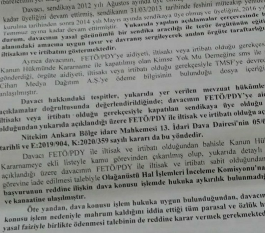 Ekte resmi yer alan Ankara 22. İdare Mahkemesi kararına göre sendika üyeliği irtibat ve iltisak için yeterli sayılmıştır, kimse Yok mu derneğine bağış tali sebep olarak kabul edilmiştir. Sendika üyeliğinin irtibat ve iltisak için yeterli olduğuna dair Ankara BİM 13.İdari Dava Dairesinin kararına atıf yapılmaktadır.