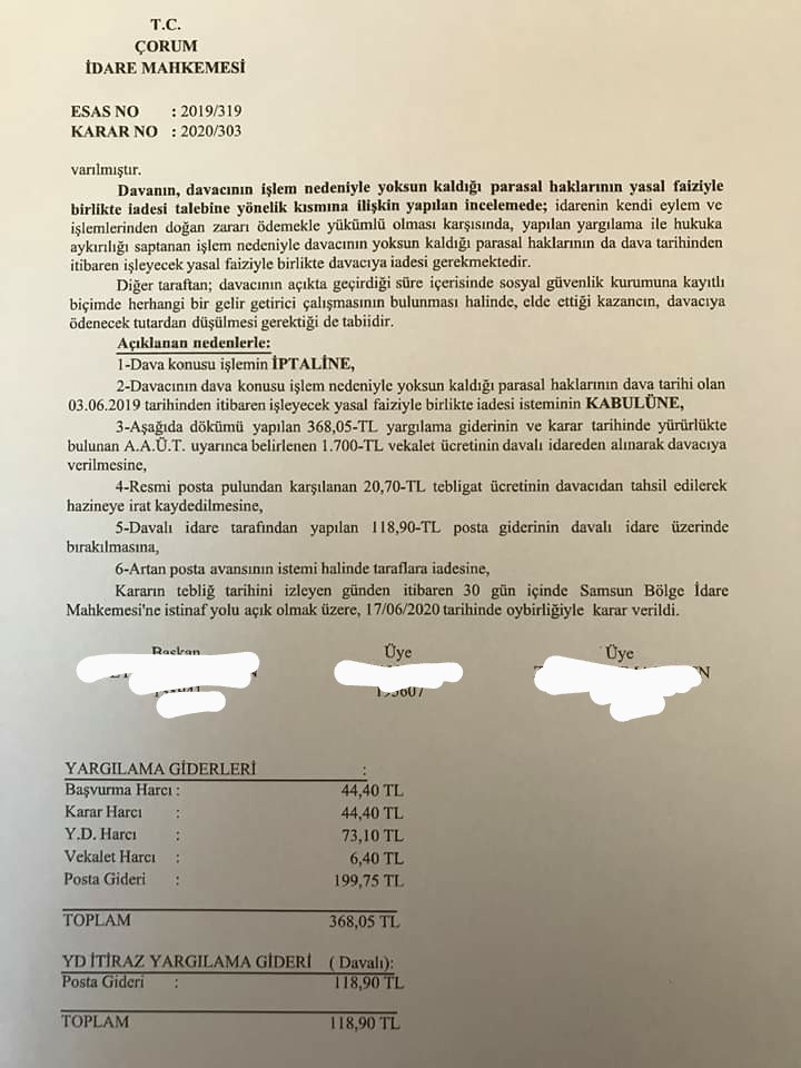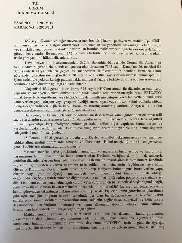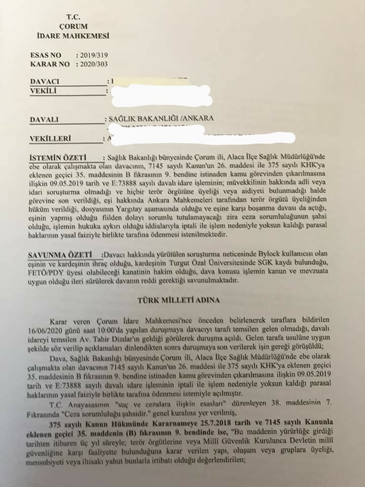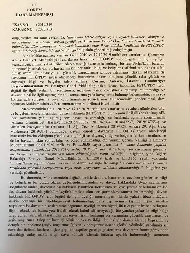Ekte resmi yer alan İdare Mahkemesi kararına göre kişinin yakın akrabaları hakkında yürütülen soruşturma veya kovuşturmanın ilgili hakkında kamu görevinden çıkarma gerekçesi yapılamayacağı ifade edilerek göreve iade talepli açılan davanın kabulüne karar verilmiştir.