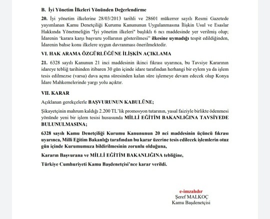 Müracaatının hazırlanmasına yardımcı olduğum göreve iade edilen öğretmenin banka promosyonu ile ilgili başvurusu hakkında Kamu Denetçiliği Kurumunun ekte resmi yer alan 26.06.2020 tarihli ve 2020/6334 basvuru numaralı kararıyla promosyonun yasal faiziyle ödenmesine karar vermiştir. Promosyon ile ilgili Kamu Denetçiliği Kurumuna müracaat edilebilir, İdare Mahkemeleri bu konuda red verebiliyor, red verilmesi halinde davalı idare lehine vekalet ücreti hükmedilmektedir, KDK talebi red etse bile yargılama gideri ve vekalet ücreti söz konusu değildir