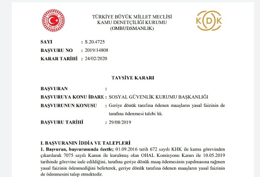 Ekte yer alan KDK kararına göre, görevine iade edilen memura geriye dönük ödenen maaşın FAİZİYLE ödenmesi gerektiği yönünde kuruma tavsiyede bulunulmuştur;