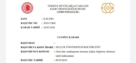 Başvuranın personel özlük dosyası haricinde tutulan ve elektronik ortamlarda bulunan görevden uzaklaştırıldığına dair kayıtların silinmesi hususunda SELÇUK ÜNİVERSİTESİ REKTÖRLÜĞÜNE TAVSİYEDE BULUNULMASINA,