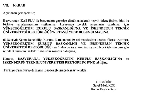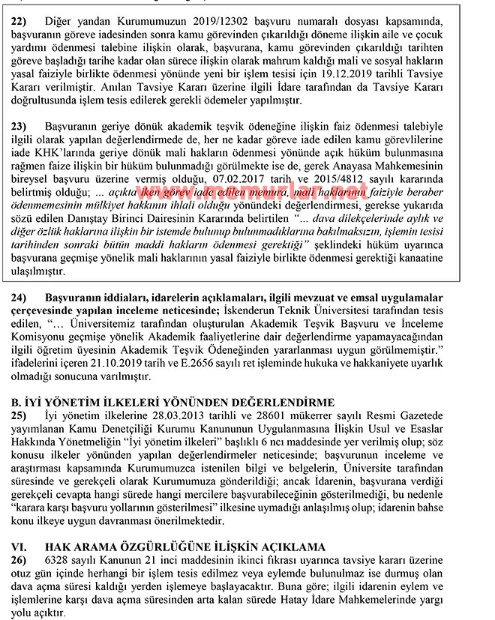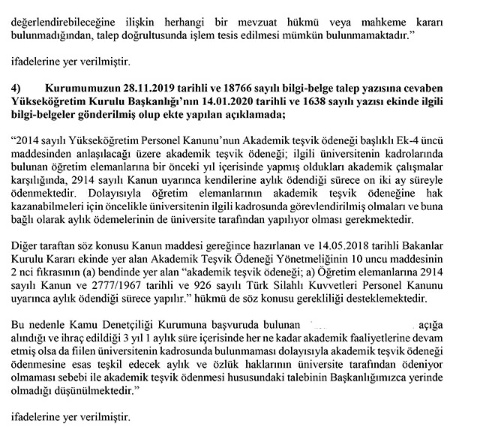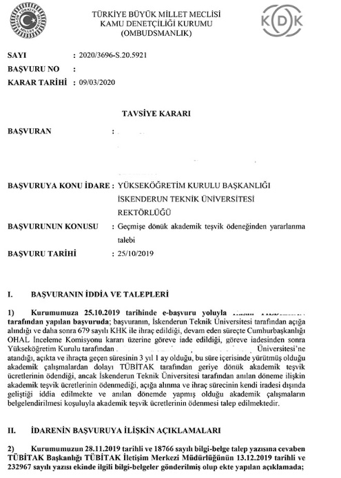 Kamu Denetçiliği Kurumu, OHAL Komisyonu kararıyla göreve iade olan akademisyene, açıkta iken yaptığı akademik faaliyetlerden dolayı akademik teşvik ödeneği ödenmesi konusunda tavsiye kararı aldı