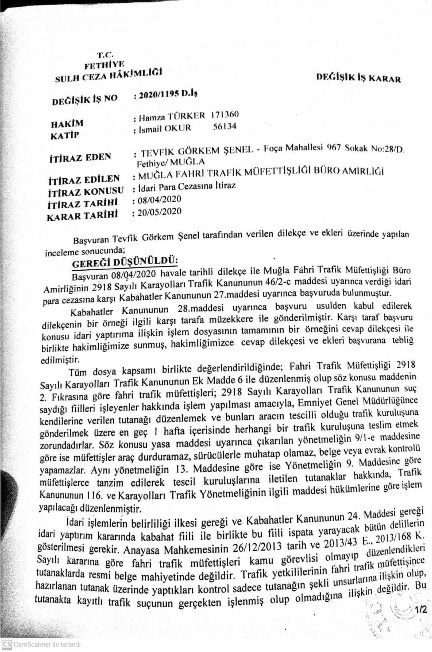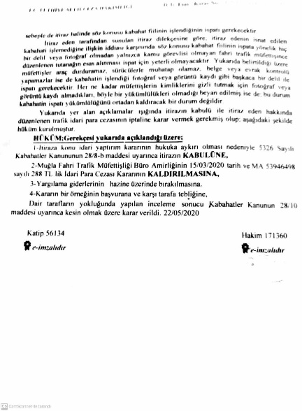 Ekte resmi yer alan Sulh Ceza Hâkimliği kararı incelendiğinde resim veya video kaydı olmaksızın fahri trafik müfettişince kesilen trafik idari para cezasının iptaline karar verilmiştir, ilgili karar ektedir;