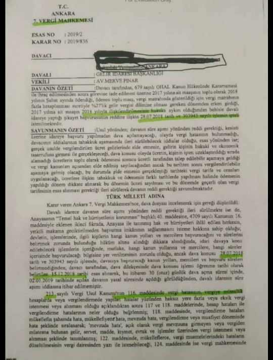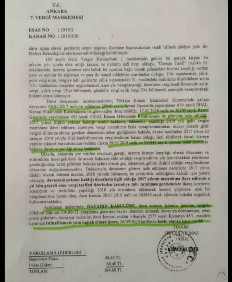 Göreve iade edilene geriye dönük ödenen toplu maaştan gelir vergisinin yüksek dilimden tahsil edilmesi hukuka aykırıdır, ilgili karar ektedir;