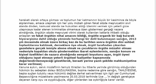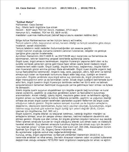 Ekte resmi yer alan Yargıtay kararı incelendiğinde 2014 öncesi ve kısa süre sonrası dini sohbetlere katılma, derneklere üye olma, gazete aboneliği ve iltisaklı kuruma çocuk göndermenin örgütsel faaliyet olarak kabul edilemeyeceği ifade edilmiştir.