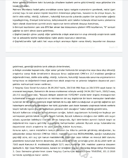 Ekte resmi yer alan Yargıtay kararında ankesörle ilgili genel ilkelerin gözetilerek araştırma yapılması gerektiği ifade edilmiştir, ayrıca bylock ile ilgili ayrıntılı tespit ve değerlendirme tutanağının getirtilmesi ile duruşmada okunması ile sanık ve müdafiine diyeceklerinin sorulması gerektiğini bildirilmiştir.
