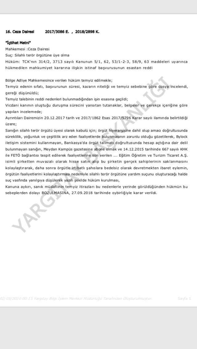 Ekte resmi yer alan Yargıtay kararına göre talimat döneminde Bank Asya hesabında artış tespit edilemeyen, iltisaklı gazeteye abone olan ve irtibatlı şirkette gerçek hissedarı gizlemek amacıyla ortak olduğu iddia edilen kişiye örgüt üyeliğinden verilen ceza bozularak bu eylemlerin yardım suçu kapsamında olduğu ifade edilmiştir.
