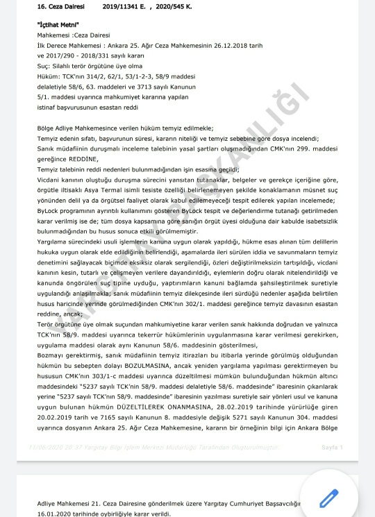 Ekte resmi yer alan Yargıtay kararında müzahir termal otelde konaklamanın örgütsel faaliyet olarak kabul edilemeyeceği ifade edilmiştir, ayrıca bylock ile ilgili ayrıntılı tespit ve değerlendirme tutanağı dosyada olmasa bile dosya kapsamına göre sanığın örgüt üyeliği suçunun sübuta ermesi nedeniyle bu eksiklik bozma sebebi yapılmamıştır.