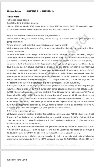 Ekte resmi yer alan Yargıtay kararına göre sanığın mütevelli olduğunun hangi delillerin dikkate alınarak tespit edildiğinin karardan anlaşılamadığı, şirket hissedarlığının ise yardım suçu kapsamında değerlendirilmesi gerektiği ifade edilerek üyelikten verilen cezanın bozulmasına karar verilmiştir;